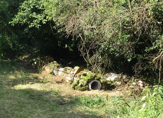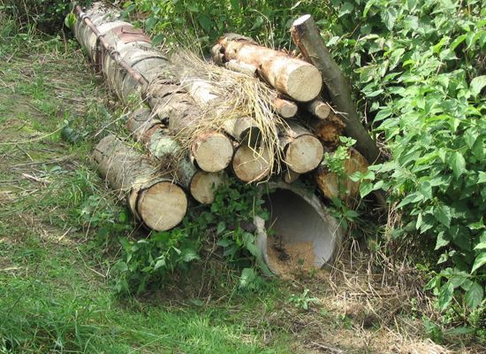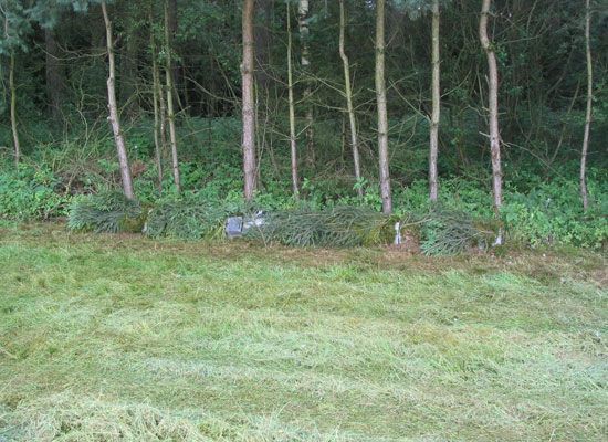 Mit Moos und Fichtenzweigen verblendete Falle – fast unsichtbar. TIPP: Legt unter den Betonrohren Bindedraht, dann könnt ihr das Moos mit den Fichtenzweigen gut fixieren.